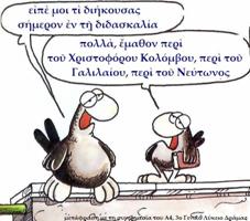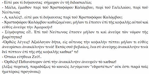 Περιγραφή της παρουσίασης PowerPoint και της διαδικασίας που δημιουργήθηκε παράλληλα με τη διδασκαλία Παρουσιάζεται στους μαθητές ένα απόσπασμα από το κόμικ «Αστερίκιος εν Ολυμπία» που είναι μεταφρασμένο στα αρχαία ελληνικά από το Φάνη Ι. Κακριδή. Αυτό εξυπηρετεί να αποκτήσουν οι μαθητές την αίσθηση ότι η αρχαία ελληνική υπήρξε γλώσσα καθημερινής επικοινωνίας και όχι μόνο γλώσσα της αρχαίας ελληνικής γραμματείας. Ακολούθως προβάλλονται κόμικ του Αρκά σχετικά με την εκπαίδευση από τη συλλογή «... με τον κηδεμόνα σου». Η ιδέα μοιάζει να έρχεται ως φυσικό επακόλουθο, να προσπαθήσουμε όλοι μαζί να αποδώσουμε τους μικρούς και σύντομους διαλόγους στην αρχαία ελληνική γλώσσα αξιοποιώντας τις λίγες γνώσεις που έχουν κατακτηθεί. Επιλέχθηκε ένα συγκεκριμένο κόμικ με ένα χαρακτηριστικό που το κάνει περισσότερο χιουμοριστικό σε αυτή την περίπτωση. Αναφέρεται σε πρόσωπα μεταγενέστερα, όπως ο Χριστόφορος Κολόμβος. Το αποτέλεσμα είναι ενδιαφέρον. Οι μαθητές αντιλαμβάνονται το πρόβλημα ως πρόκληση και παιχνίδι και αυτό τους οδηγεί στον προβληματισμό για την επίλυση του. Κινητοποιούνται μαθητές που δεν είναι τόσο «καλοί» στα αρχαία ελληνικά και δεν ανταποκρίνονται κατά την κλασική διδασκαλία, κυρίως όταν γίνεται με την «γραμματικο-συντακτική» μέθοδο. Επίσης κινητοποιούνται μαθητές που έχουν ξεχωριστή αίσθηση της γλώσσας και λειτουργεί η εμπειρία της αρχαίας ελληνικής γλώσσας με την οποία έχουν, σε κάποιο βαθμό, εξοικειωθεί. Με το χιουμοριστικό χαρακτήρα των κειμένων έχει διαμορφωθεί το κατάλληλο παιδαγωγικό κλίμα στην τάξη (Αραβανής 2008). Οι μεταφράσεις των μαθητών ακούγονται και συζητιούνται στην τάξη ώστε να καταλήξουμε σε μία. Χρησιμοποιούνται λεξικά, γραμματική και συντακτικό για τον έλεγχο της μετάφρασης. Ακολούθως το «αρχαίο» κείμενο που προκύπτει ψηφιοποιείται στο word με πολυτονική γραμματοσειρά. Παρατίθεται το κείμενο με τους διαλόγους: «- Για πες μου, τι έμαθες σήμερα στο μάθημα; - Πολλά!.. Έμαθα για το Χριστόφορο Κολόμβο, για το Γαλιλαίο, για το Νεύτωνα. - Α, ωραία!.. Για πες μου τι έμαθες για το Χριστόφορο Κολόμβο; - Ο Χριστόφορος Κολόμβος, εκεί που καθόταν του έπεσε ένα μήλο στο κεφάλι και αμέσως ανακάλυψε την Αμερική! - Τα έχεις μπερδέψει!.. Στο Νεύτωνα έπεσε ένα μήλο στο κεφάλι και ανακάλυψε το νόμο της βαρύτητας! - Δίκιο έχεις! Σημασία έχει πάντως, ότι σε όποιον πέσει ένα μήλο στο κεφάλι, αμέσως κάνει μια ανακάλυψη! Εκτός από σένα βέβαια που για να κάνεις κάποια ανακάλυψη πρέπει να σου πέσει στο κεφάλι ένα καρπούζι! - Τι ανοησίες Θεέ μου!.. - Σωστά! Ακόμα και τότε είναι πιο πιθανό να κάνει την ανακάλυψη το καρπούζι!» Ακολουθεί η απόδοσή του στη «αρχαία ελληνική». (σχήμα 1)